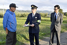 ■リンゴ収穫最盛期、盗難防止へ決意 黒石地区防犯協会と黒石警察署は17日、リンゴ盗難防止総決起大会・合同パトロールを行った。収穫最盛期に向け、関係者らが結束を誓い、防犯意識を高めた。黒石市青山のリンゴ園には樋会長、對馬署長が盗難防止のチラシを手渡した。對馬署長は「野積みはしないで。不審な人や車を見かけたら直接声をかけずに、間違っていてもいいので、勇気をもって110番通報を」と呼びかけた。 |