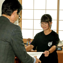 ■黒石の魅力向上には…/黒石東小 黒石東小学校6年生が17日、市役所を訪れ、修学旅行の一環で取り組んだ「黒石の魅力アップ大作戦〜函館から学ぼう〜」の成果を樋憲市長に披露した。地域ブランド市町村魅力度ランキングで修学旅行先の函館市が1位に対し、黒石市はランキング外。7月の修学旅行で両市の違いについて調査。黒石の魅力アップのためのアイデア、意見を作文にまとめた。 |