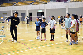 ■現役選手から学ぶ/みゆきバド教室 黒石市のみゆきジュニアバドミントンクラブは24日、スポカルイン黒石で教室を開いた。弘前市出身の成田行磯選手=北都銀行=を講師に、基本練習やゲーム練習を通して技術向上、モチベーションアップにつなげた。選手たちは「ラケットの動かし方などを教えてもらった。きょう教えてもらったことを試合で生かしたい」「試合の時に速く動けるようになりたい」と意欲を高めた。 |